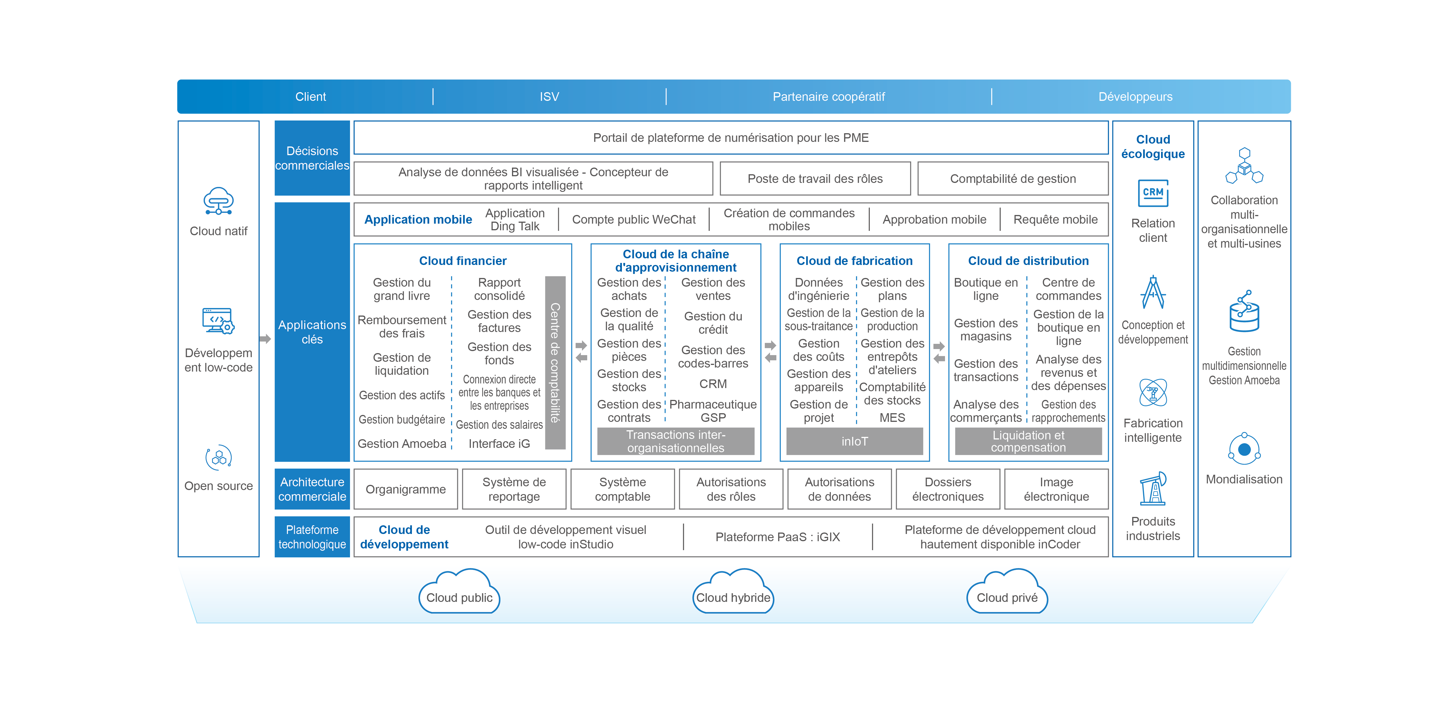 InSuite d'Inspur Haiyue est un ERP intelligent con?u pour les petites et moyennes entreprises. Il repose sur une infrastructure technologique native du cloud basée sur des technologies open source et une architecture intégrée appelée ? Fabric Business Latitude ?. Pré-intégrant le modèle d'IA entreprise inGPT, il adopte un modèle de développement SaaS entièrement en ligne et à faible code, et couvre l'ensemble du processus numérique, depuis l'achat jusqu'au paiement, de la demande à la fabrication, de la commande à la réception, de l'inventaire à l'exécution. Avec les noyaux que sont la finance cloud, la cha?ne d'approvisionnement cloud, la fabrication cloud, la distribution cloud, le cloud de développement et le cloud écologique, il propose des solutions sectorielles pour des industries telles que la biopharmacie, la transformation alimentaire, la production de spiritueux, les services modernes, la logistique sous cha?ne du froid, et la fabrication de projets. Cela aide les entreprises à améliorer quatre capacités clés : l'innovation et la livraison de produits, la croissance des revenus, la ma?trise des co?ts et l'exploitation intelligente, renfor?ant ainsi le développement de haute qualité des petites et moyennes entreprises.