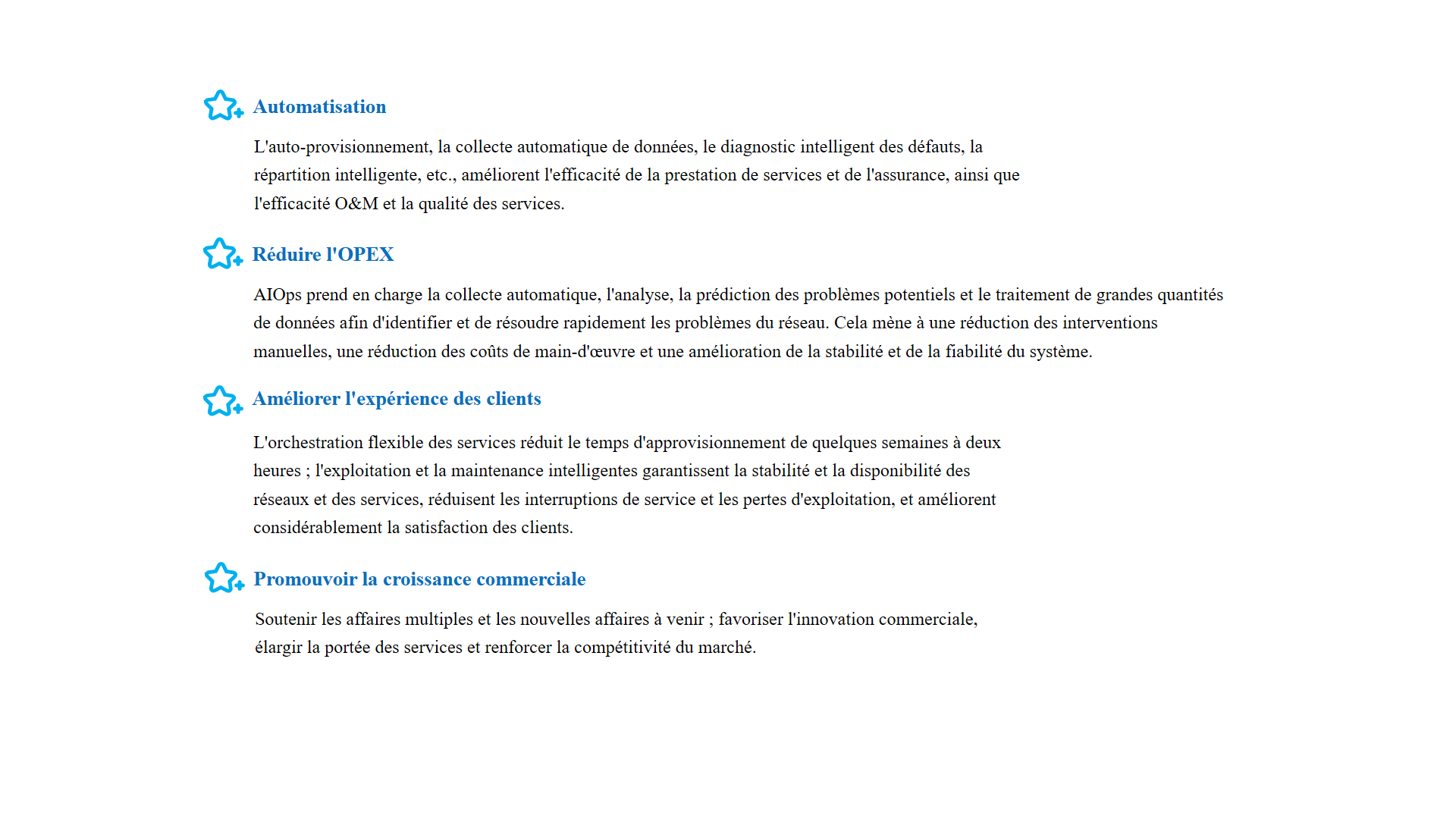 L'OSS numérique basé sur l'IA et la technologie ML aide le client à optimiser les processus opérationnels, à réduire les interventions manuelles, à améliorer l'efficacité de l'exécution et de la maintenance et à réduire les coûts. Il est plus évolutif pour s'adapter facilement et en douceur à la croissance future des affaires et à l'évolution du réseau.