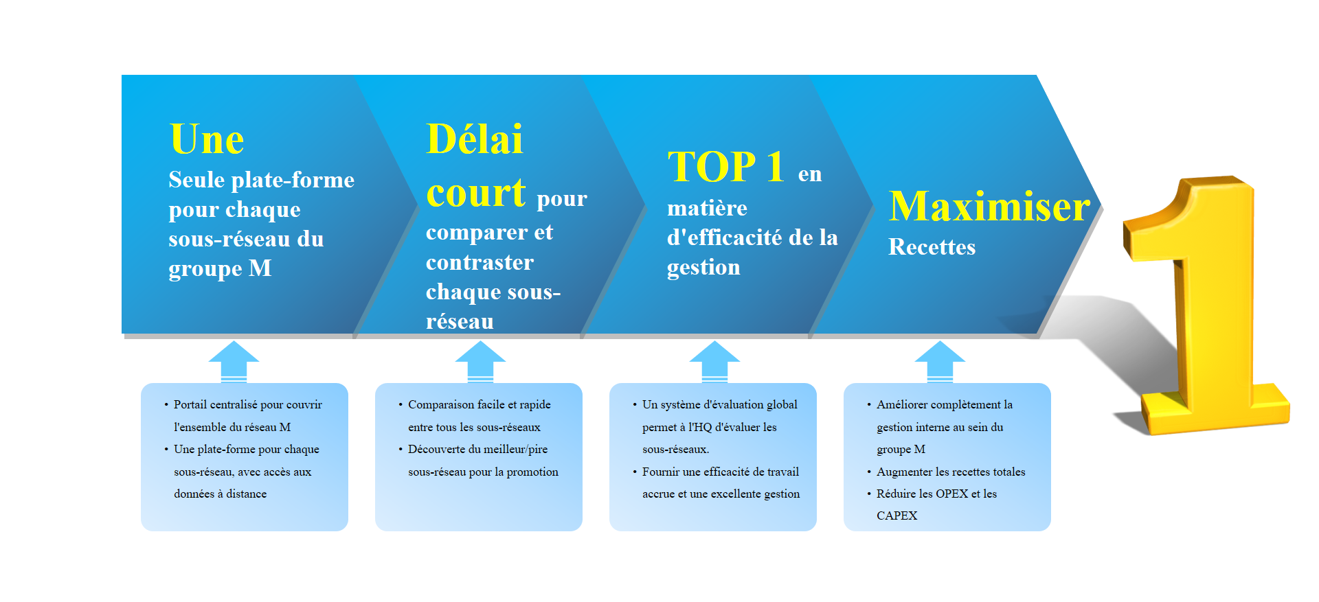 Le groupe M a mis en place un portail centralisé à Dubaï en synchronisant périodiquement les données de chaque sous-réseau. Il permet de contrôler les performances globales du réseau de chaque pays et aide l'HQ du groupe M à évaluer l'exploitation et la gestion de chaque sous-réseau.