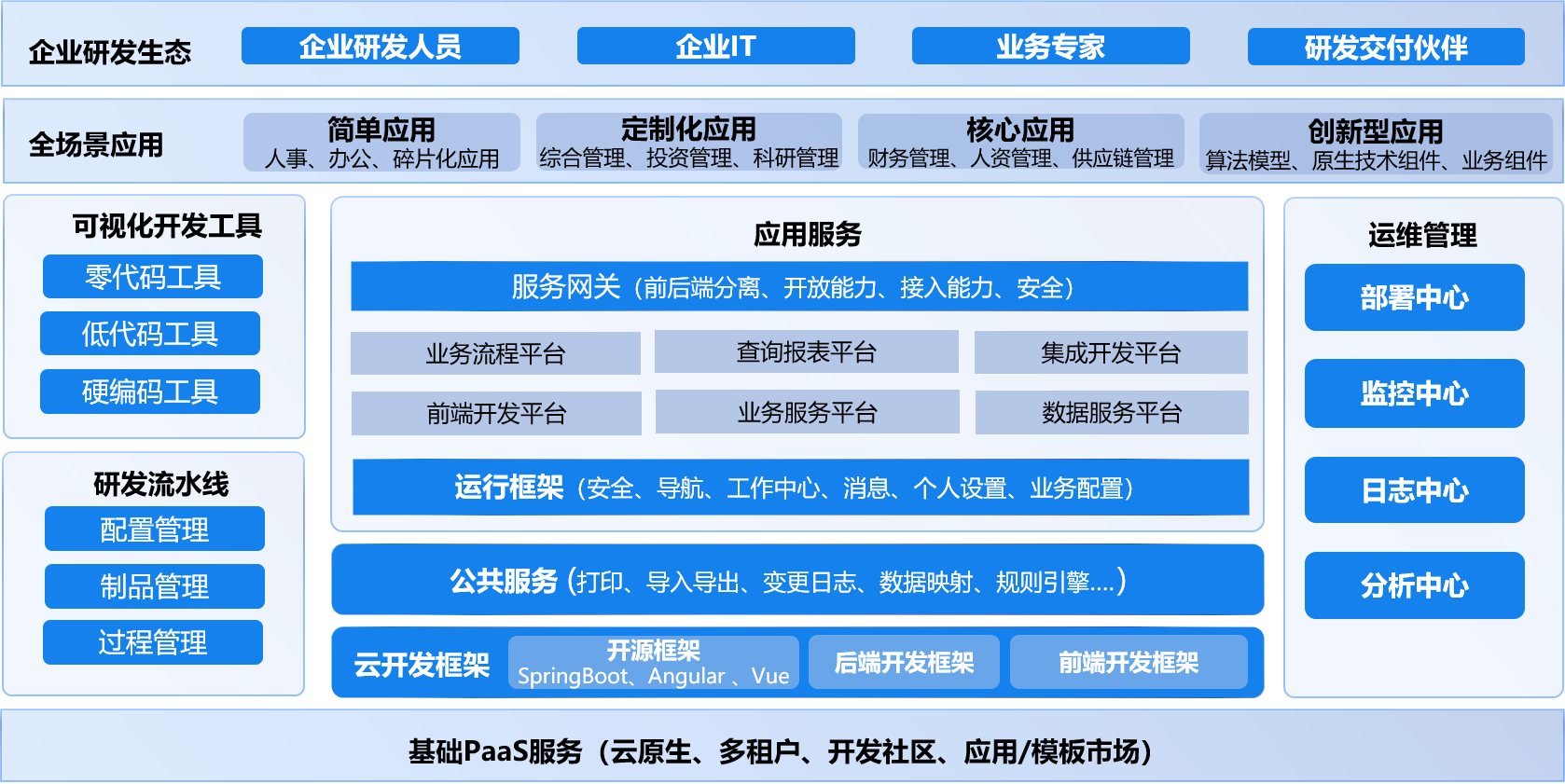 基于UBML统一建模体系,封装全Web化在线开发设计器,支持零代码、低代码、硬编码的全场景开发协同,激发企业创新活力,提升研发效能。