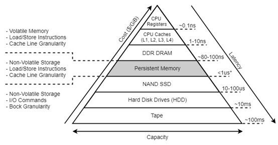 在现有存储架构中,内存和存储介质之间存在容量、性能和时延的差距,英特尔® 傲腾™ 持久内存位于内存和存储介质之间,能填补两者间的性能和时延差距,对存储层次模型进行重新划分和定义。英特尔® 傲腾™ 持久内存读写带宽比NVME设备高数倍,并大幅降低延时问题。另外,由于写入方式不同,英特尔® 傲腾™ 持久内存也比Flash NAND更耐用,并能支持比传统DRAM更大容量的系统内存配置。与传统DRAM不同,英特尔® 傲腾™ 持久内存将提供前所未有的高容量,经济性和持久性组合。通过扩展经济实惠的系统内存容量(每个CPU Socket大于3 TB),最终客户可以使用支持这种新型内存的系统,通过在处理器附近移动和维护更大量的数据来更好地优化其工作负载,并极大限度地降低延迟从系统存储中获取数据。英特尔® 傲腾™ 持久内存将以每个模块高达512GB的容量提供。同时,英特尔® 傲腾™ 持久内存具有的非易失性这一大优势能够保证数据在掉电后或系统维护中不会丢失。