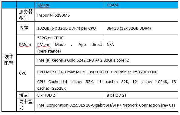 测试使用4台服务器,一台服务器用于管理节点,部署HDFS NameNode和HBase Master,另外三台服务器作为数据节点,部署HDFS DataNode和HBase Region Server,四台机器部署zookeeper集群。PMem方案中每个数据节点使用192GB(6x32GB)的DRAM。DRAM方案中使用384GB内存。