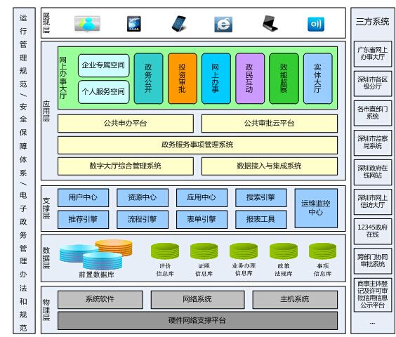 网上办事大厅的核心栏目与市政府在线网站、政府投资跨部门协同办理平台、事项管理系统、各委办局的申办受理和审批系统、交叉认证平台、信访系统、监察局相关系统、商事主体登记及许可信用公示平台,以及与省网上办事大厅、各区网上办事大厅和社会第三方的物流、网银等系统产生关系。