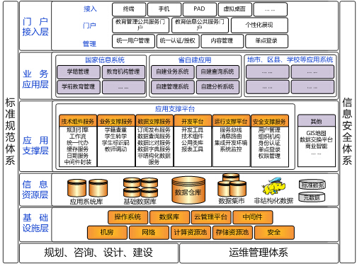 数据中心建设的总体框架由五个层面、三大保障体系共同构成,其中五个层面包括基础设施层、信息资源层、应用支撑层、业务应用层和门户接入层;三大保障体系包括信息安全体系、标准规范体系、运维管理体系。