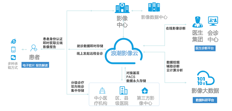 浪潮智慧医疗结合多年的医疗大数据、区域平台的行业经验和技术积累,通过实现影像数据即时存储与调阅、多源数据融合、统一制定数据标准、完善数据管理等技术手段,建立数字胶片、区域影像平台、云会诊、远程影像诊断、人工智能辅助诊断、三维重建等能力,面向各医疗机构提供一个区域网络化、线上化、全方位的影像云系统,实现影像数据互联互通、影像信息即时共享,同时促进各级医疗机构协同办公,提升影像诊断水平。