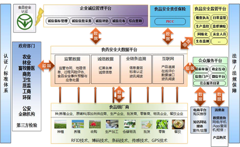 以食药安全大数据平台为核心,通过对食药监管业务数据(对内通过建立行业基础数据库,横向打通监管业务系统)、其他政府部门监管数据、互联网(电商、点评网)数据、厂商生产经营数据等进行整合,创新建设食品药品安全监管系统、食品药品安全追溯系统、公共服务系统等应用,形成食药监管部门、相关政府部门、社会公众、厂商、互联网公司等共同参与的食品药品安全监管新模式。