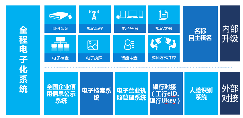 在现有登记注册网上申请、受理等服务的基础上,根据全流程登记改革要求对登记业务流程进行优化,升级现有的工商综合业务管理平台、网上服务平台,实现以身份认证技术为信任支撑的网上申请、网上受理、网上审核、网上公示、网上发照、网上亮照、网上归档等全程电子化登记管理方式,为企业登记注册以及凭营业执照从事电子商务等相关经营活动提供更大地便利。