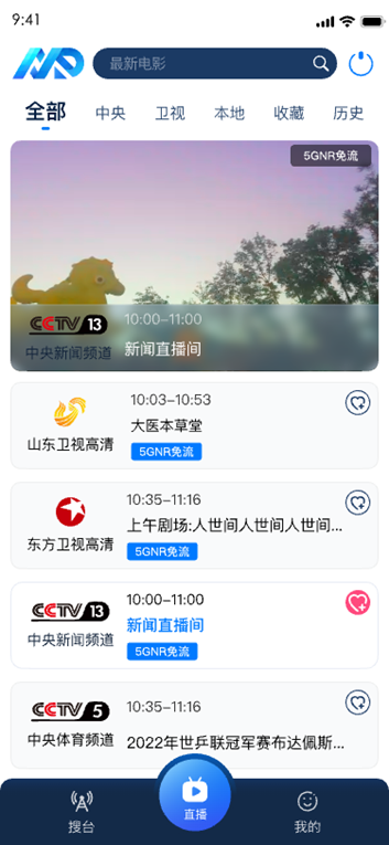 • 终端应用在5GNR广播基站信号覆盖范围内优先通过5GNR广播播放直播节目的功能。同时为保证用户观看体验,在5GNR广播不可用、且双向网链接正常的情况下,终端允许用户通过双向网络接收观看直播节目。