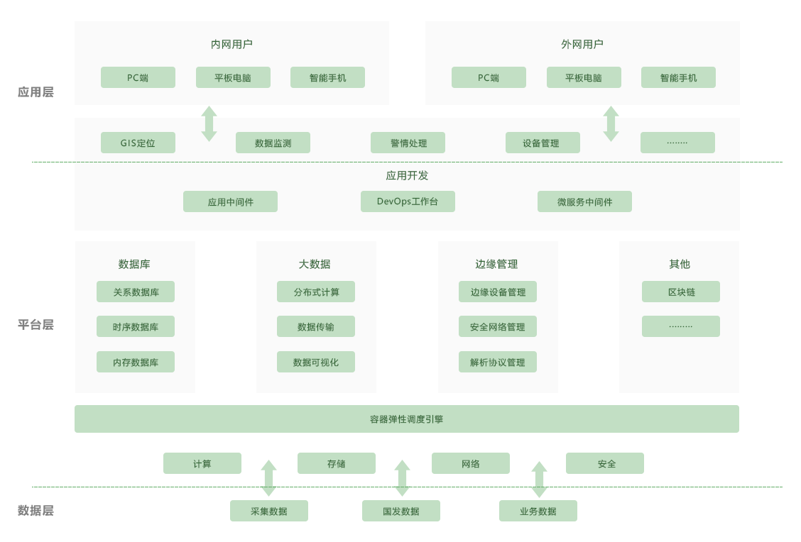 数据层:主要负责整个系统的数据采集以及存储,主要来源为现场设备采集 数据、国家发布数据、业务往来的数据等,为平台和应用形成强大的数据支撑 平台层:平台层分为IaaS层和PaaS层。IaaS层对外提供标准的符合OpenStack规范要求的REST API。对内在功能性、可靠性、安全性、支撑工具等方面全面优化开源 OpenStack,全面接入OpenStack各领域核心组件,提供完善的云基础设施服务能力,涵盖计算、存储、网络、安全等 IaaS服务,根据客户需求能够支持公有云、私有云和混合云三种不同应用模式。PaaS层:提供云计算、大数据、应用开发、中间件、人工智能、区块链等基础PaaS服务能力。通过浪潮企业大脑产品,面向各个行业和领域,提供以数据为核心的工业数据服务、机理模型服务和业务微服务,此外还提供了面向工业设备连接的物联网服务、云化软件和APP开发服务及基于区块链技术构建的云资源管理库 应用层:通过平台的搭建,主要面向石油、化工、冶金等不同行业的不同业务流程,提供GIS定位、数据监测、警情处理、设备管理等相关的应用,为相关人员随时随地关注安全状况和污染情况,对企业全方面的有效管理