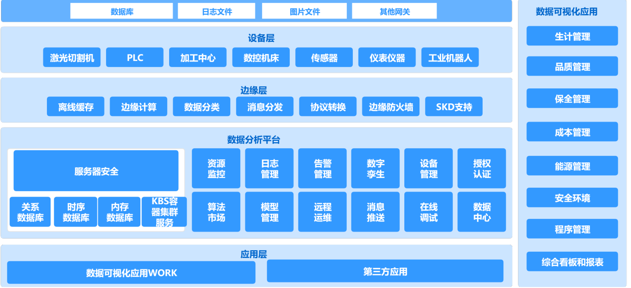 满足客户生产安全工程中机器人高性能作业需求,通过设备层基于软网关物理连接到边缘层,通过协议在数据分析平台上进行整体分析,最终在应用层可视化展现。