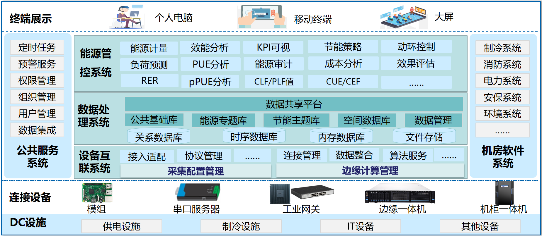 基于统一的数据中心基础设施,建设连接设备、公共服务系统、机房软件系统、设备互联系统、数据处理系统、能源管控系统,面向数据中心提供能源管理和节能服务。依托采集能耗数据、分析能耗趋势、调整控制策略,从而实现能耗的可规划、可计量、可控制、可评估。为绿色数据中心规划、建设、指标优化、评测提供全栈支撑。