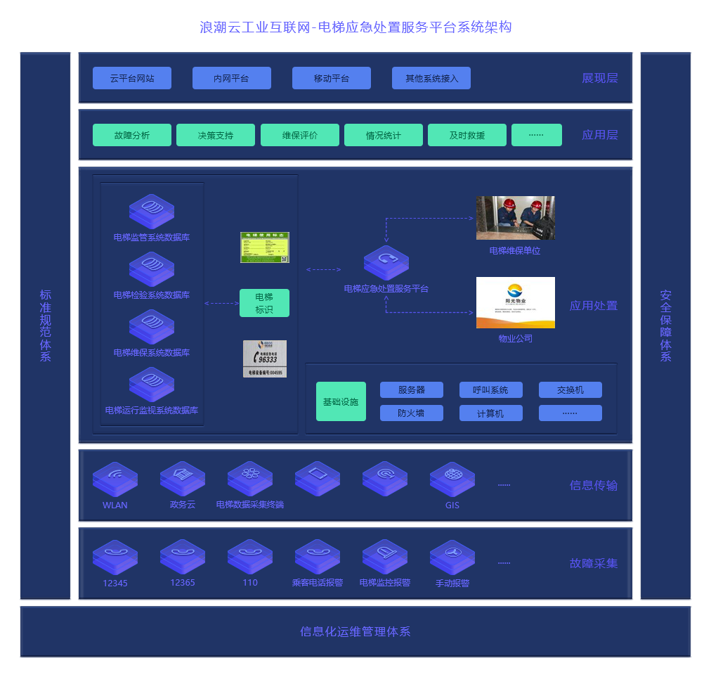 电梯应急处置服务平台的建设运行,为开展标准的制定工作奠定了基础,通过运用平台运行总结的经验,为实现标准化的手段给予了有利支撑。特别是山东省强制地方标准《电梯标志和标识》(DB37/2604-2014)、山东省推荐性地方标准《电梯更新、改造、修理技术评价规则》(DB37/T 2645-2015)等标准都源于电梯应急处置服务平台建设带来的良好效应和促进作用 将系统平台可依托公有云、政务云、私有云等云平台建设,提供可靠地基础 IT 服务平台,有利于信息的互联互通,避免产生“信息孤岛”,并且安全稳定,有助于使用、监管、指挥调度、维保单位在电梯使用、维护、救援等工作方面落实主体责任将系统平台的软件集成到政务云,为其提供了相对安全稳定的环境。把传统的政务应用转移至平台,提供可靠地基础 IT 服务平台,有利于信息的互联互通,避免产生“信息孤岛”,并且安全稳定。96333 作为电梯的应急处置服务平台,有且相对稳定安全的环境,才能更好的发挥其效用,着力使维保单位在信息数据、维保工作等方面落实维保单位的主体责任 应用层提供故障分析、决策支持、维保评价、情况统计、及时救援等应用功能 电梯应急处置服务平台基于基础设施(服务器、呼叫系统、交换机、防火墙、电脑)进行建设,建设电梯应急处置中心,与电梯维保单位、物业公司建立快速联接,通过电梯标志标识,对电梯维保信息、综合信息进行管理,并对电梯应急情况进行处置。移动APP端可进行移动应急处置,电梯维保情况也可进行移动端记录查询 基于本平台的建设,电梯信息及相关采集数据通过网络进行传输。平台搭建具有完善的标准规范体系、安全保障体系及运维管理体系,以保障信息传输和故障采集的过程安全 应用层提供故障分析、决策支持、维保评价、情况统计、及时救援等应用功能 电梯应急处置服务平台基于基础设施(服务器、呼叫系统、交换机、防火墙、电脑)进行建设,建设电梯应急处置中心,与电梯维保单位、物业公司建立快速联接,通过电梯标志标识,对电梯维保信息、综合信息进行管理,并对电梯应急情况进行处置。移动APP端可进行移动应急处置,电梯维保情况也可进行移动端记录查询 基于本平台的建设,电梯信息及相关采集数据通过网络进行传输。平台搭建具有完善的标准规范体系、安全保障体系及运维管理体系,以保障信息传输和故障采集的过程安全