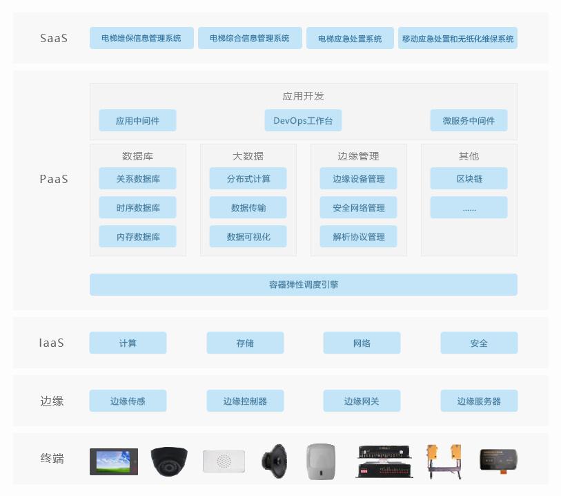 浪潮云工业互联网平台采用开放的技术路线进行建设,技术架构全面基于Openstack、Kubernetes、Hadoop、OpenTSDB等开源技术框架进行集群化统一管理优化设计。物联网服务采用自主研发,支持单实例百万级别设备安全稳定接入;大数据全面采用Hadoop生态系,包括时序数据库,采用基于HBase的OpenTSDB构建;数据库支持MySQL、PGSQL、MongoDB等多种数据,支持高可用的集群模式交付 IaaS 层:包括各种硬件资源的设备、高性能计算集群等及其虚拟化 云洲大脑:为系统提供物联感知、视频感知、大数据分析预处理等工具,实现电梯终端设备接入能力、数据处理能力、数据服务能力 SaaS 层:提供各种传统工具类软件、管理类软件的工业应用服务 终端包括电梯故障信息采集分析仪、数据传输中继器、安装在轿箱顶部的各种传感器包括平层及方向感应器、门开关感应器、红外人体感应器、基站感应器、上极限感应器、下极限感应器,用于采集电梯的信号、电梯维保信息屏(轿厢机)、电梯维保信息屏(门厅机)、双向视频对讲机等 边缘层:平台提供的边缘控制器支持主流输入输出标准,除了支持主流PLC控制器,还提供了国产化的高标准电气性能PLC控制器,并配备可视化编程工具,降低实时成本,边缘网关支持主流的工业控制协议接入和转换,并提供MQTT、HTTP等上行协议,边缘云提供容器化的调度引擎,支持与云进行交互