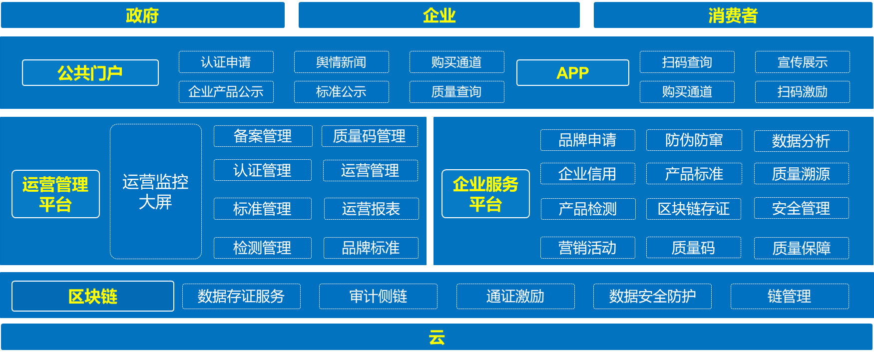 区域品牌公共服务平台打造“122N”体系,即“一链两平台两端N服务”。一链为区块链平台,基于区块链技术进行存储,利用区块链技术确保数据安全、不可篡改;两平台为运营管理平台和企业服务平台,通过品牌数字化认证与全生命周期质量管理,支撑区域品牌企业数字化认证和品牌产品动态运营管理。两端为web端与移动端两类对外宣传门户。平台面向消费者、企业、政府提供的质量查询、窜货管理、数字化营销、动态化监管等N项数字化服务。