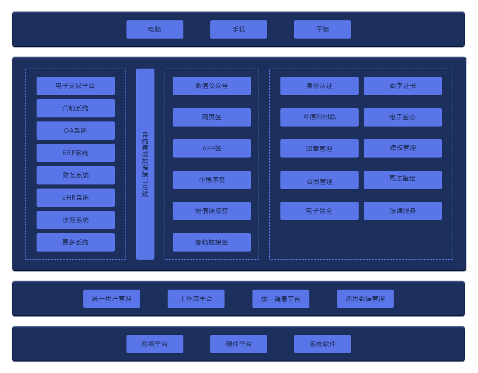 在签署层提供PC、APP、小程序签署,在接入层提供API/SDK接入方式,在应用层提供身份认证、合同签署、合同管理、司法支持四大应用模块