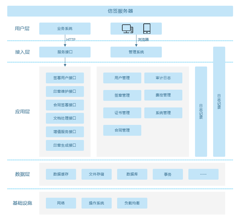 本系统底层采用Java开发语言,通讯协议采用Http传输模式,能够完美的与各种开发语言(Java、PHP、.NET、C、C++、Python)的系统接入 操作界面基于浏览器的模式,能够无缝嵌入PC、APP、小程序、公众号中实现可视化的电子合同签署 在提供各种签署服务接口的基础上,系统还提供配套的管理服务,实现智能化的管理电子合同数据 系统能够运行于windows及linux系统中,通过数据库的备份、数据的加密,负载均衡保障整个系统服务的安全、稳定