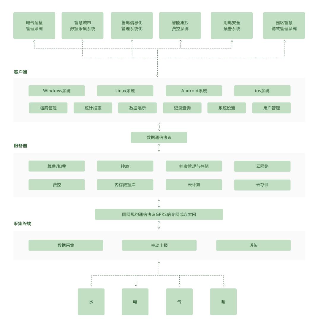 采用技术路线为采集终端采集仪表水、电、气、热等智能仪表数据,并将数据通过GPRS或以太网的形式传输、存储至浪潮云洲工业互联网平台进行相关的分析处理,用户只需打开相应系统的(Windows、Android、IOS)的应用软件,即可通过手机APP、电脑客户端完成对用能数据的随时调取、监控、分析、管理等需求。让用能信息变得简单、直观,让决策者、管理者掌控企业电气运检、售电信息、用电安全预警信息