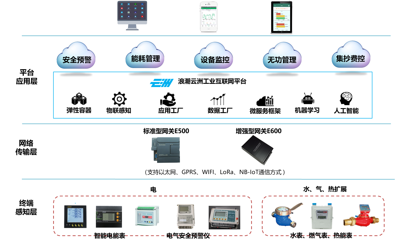 智慧能源管理业务主要包括如下类别:安全预警、能耗管理、设备监控、集抄费控,图为业务架构 终端感知层提供主要是现场的水表、燃气表、热能表,以及安装在现场的智能电表、电气安全预警仪等 网络传输层主要是指提供工业网关,负责终端智能表计与平台应用层的连接,实时采集设备数据,上报到云上的物联网服务 平台应用层基于浪潮云洲工业互联网平台搭建,提供面向能源管理领域的特定场景应用。平台提供虚拟化、物联感知、应用工厂、数据工厂、微服务、机器学习、人工智能等服务能力,支撑智慧能源管理应用 应用层提供安全预警、能耗管理、设备监控、无功管理、集抄费控等功能,服务安全用能、经济用能以及精细化管理的需求,同时支持PC端和移动端(IOS、Android)访问,满足不同用户群体使用需求