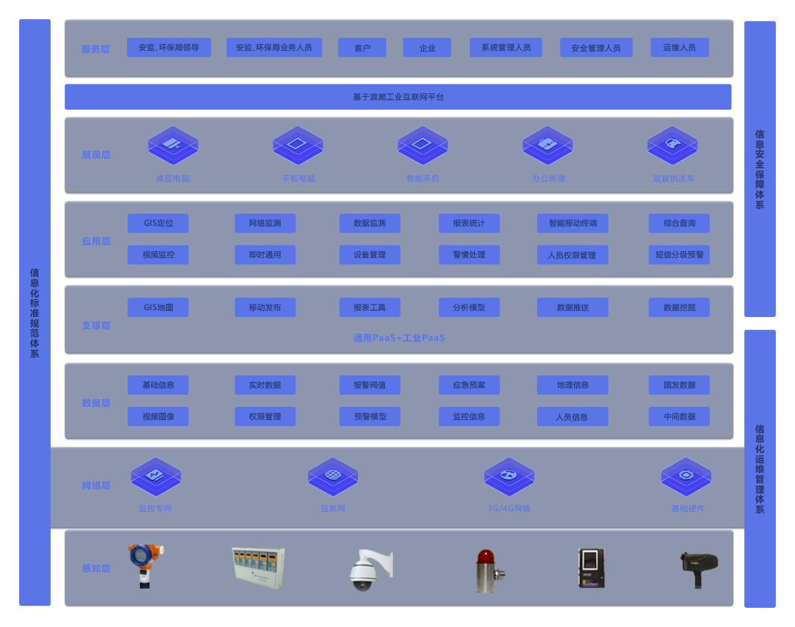 应用层:通过平台的搭建,主要面向石油、化工、冶金等不同行业的不同业务流程,提供GIS定位、数据监测、警情处理、设备管理等相关的应用,为相关人员随时随地关注安全状况和污染情况,对企业全方面的有效管理。