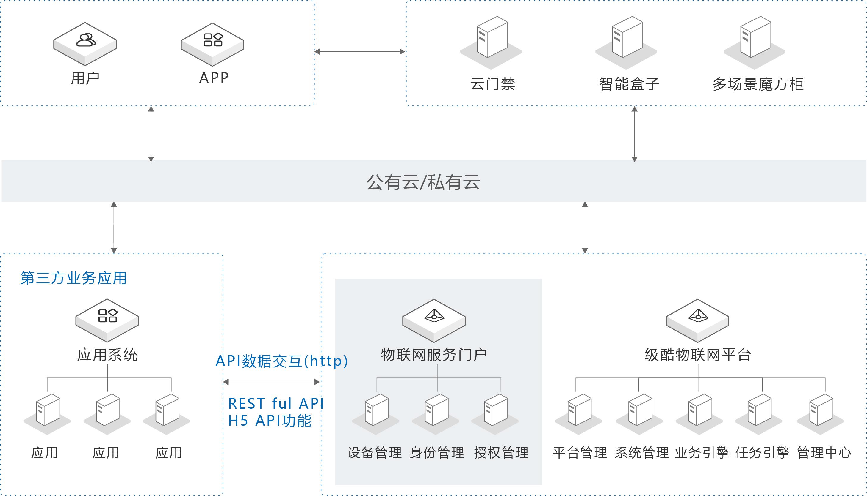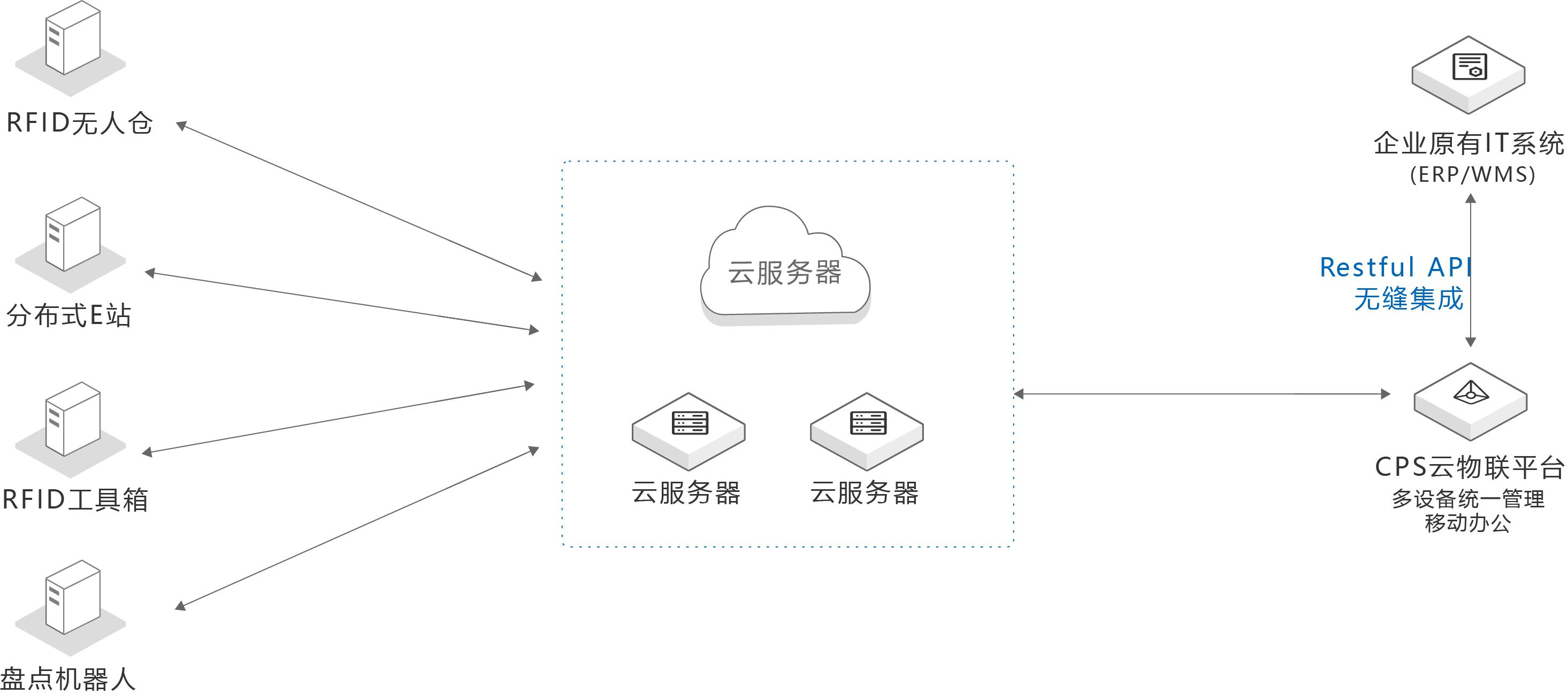基于CPS物联平台,不但能统一管理自有的智能终端(E站/RFID无人仓/RFID工具柜),通过平台提供的业务流程API引擎能力、50多类系统级封装的restful API组件和跨语言环境的开发支持,使客户与伙伴快速集成开发出丰富的跨系统应用,包括接入第三方自有智能终端、APP应用、后端业务流程IT软件系统(ERP系统/WMS库存系统/AMS资产管理系统等)等