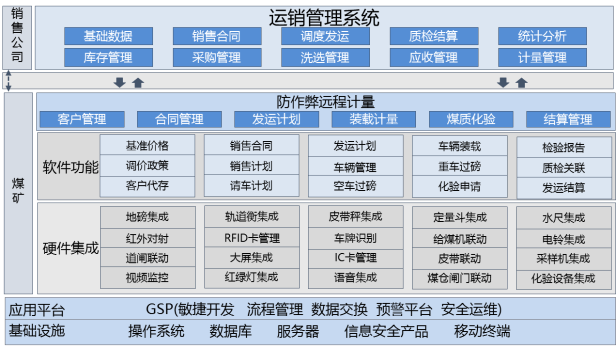 煤炭运销是矿业集团的核心核心业务,煤炭运销涉及流程长、数据量大,牵涉面广,业务灵活多变化、计量方式多样。运销过程覆盖外部煤供应商、煤炭运销公司、煤质化验中心、各驻矿运销分部、地磅、轨道衡、各种磅房监控设备。随着行业发展,煤炭企业开始从自产煤销售拓展到煤炭贸易、供应链金融等多种业务。煤炭运销管理要求实现集团运销管控与各矿现场发运、无人值守计量控制的业务集成,要求各部门数据共享,协同操作。