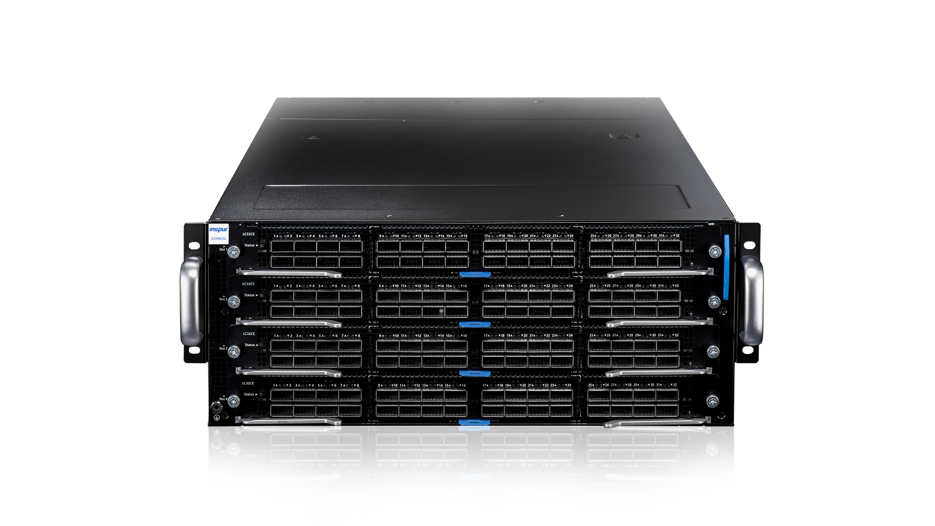 高性能汇聚交换机,最大支持128个100GE端口,模块化设计,具有4个接口卡槽位