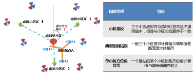 基于网络运行的数据(切换统计、MR测量等)可以计算出虚拟站点和虚拟小区,将虚拟小区与虚拟站点进行连线得到虚拟方位角。通过对照站点下小区实际方位,根据特征进行分析,可以进一步应用于方位角核查,有效发现和解决天线接反、典型用例错误、单小区方位角异常等问题,保障了方位角的数据质量。
