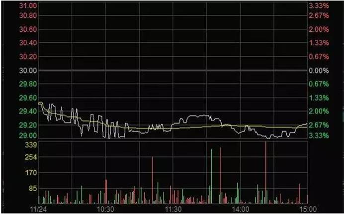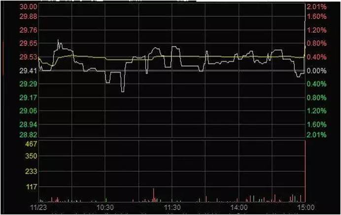 2011年11月24日,在达到操纵股价目的后,任某某将持有的50万股“X”全部卖出,导致该日股价震荡下跌。任某某通过尾市三分钟的操纵赚取近30万元。(见下图)