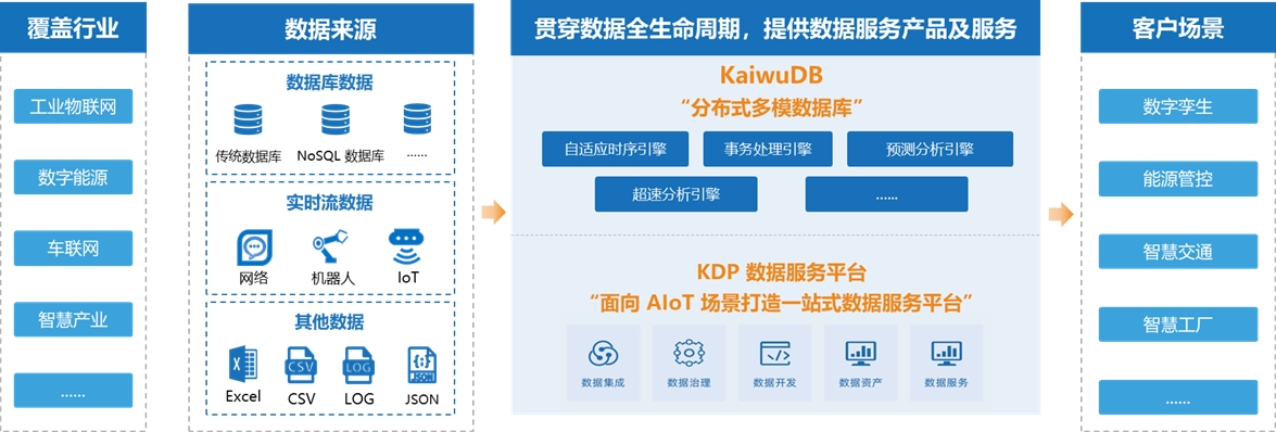 KaiwuDB 以分布式多模数据库为核心产品,面向各大行业领域提供领先创新的数据服务软件。当前,KaiwuDB 在工业物联网、数字能源、数字政务、金融等均已成功完成落地实践;未来,将能够为包括工业物联网、数字能源、车联网、智慧产业等各大行业领域提供数字化赋能,助力企业从数据中挖掘更大的商业价值。