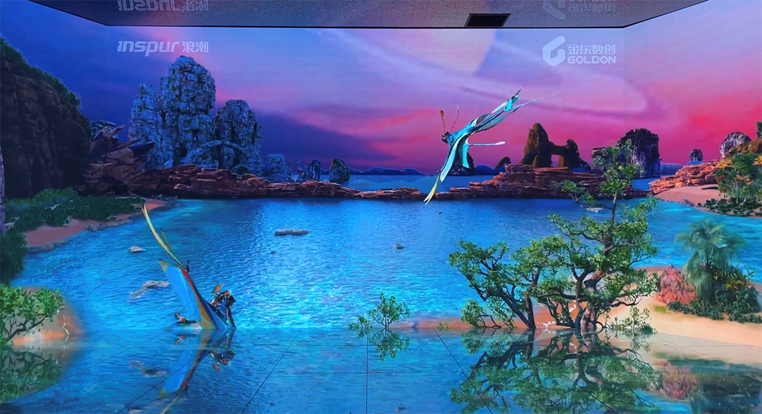 浪潮智能终端光影魔方屏这款“三折幕+地屏”的四面屏产品是浪潮智能终端正在打造的“城市元屏”体系样板之一,总面积近80㎡,全部采用浪潮自主研发的LED产品,整屏分辨率高达5632*2816,配合地面的创意防护设计和定制视频素材,让参观者站在屏幕中间即能获得身临其境的沉浸式体验。浪潮“城市元屏”将是一场视觉工业革命,以LED显示屏为载体,通过裸眼3D、LED天幕、地屏、虚拟动补、人机互动等表现形式,利用空间维度、虚拟维度、现实维度等技术,将艺术创新与数字技术相结合,助力打造城市新地标,增强城市文化魅力,真正可做到“建筑可阅读、街道可漫游、历史可穿越”。