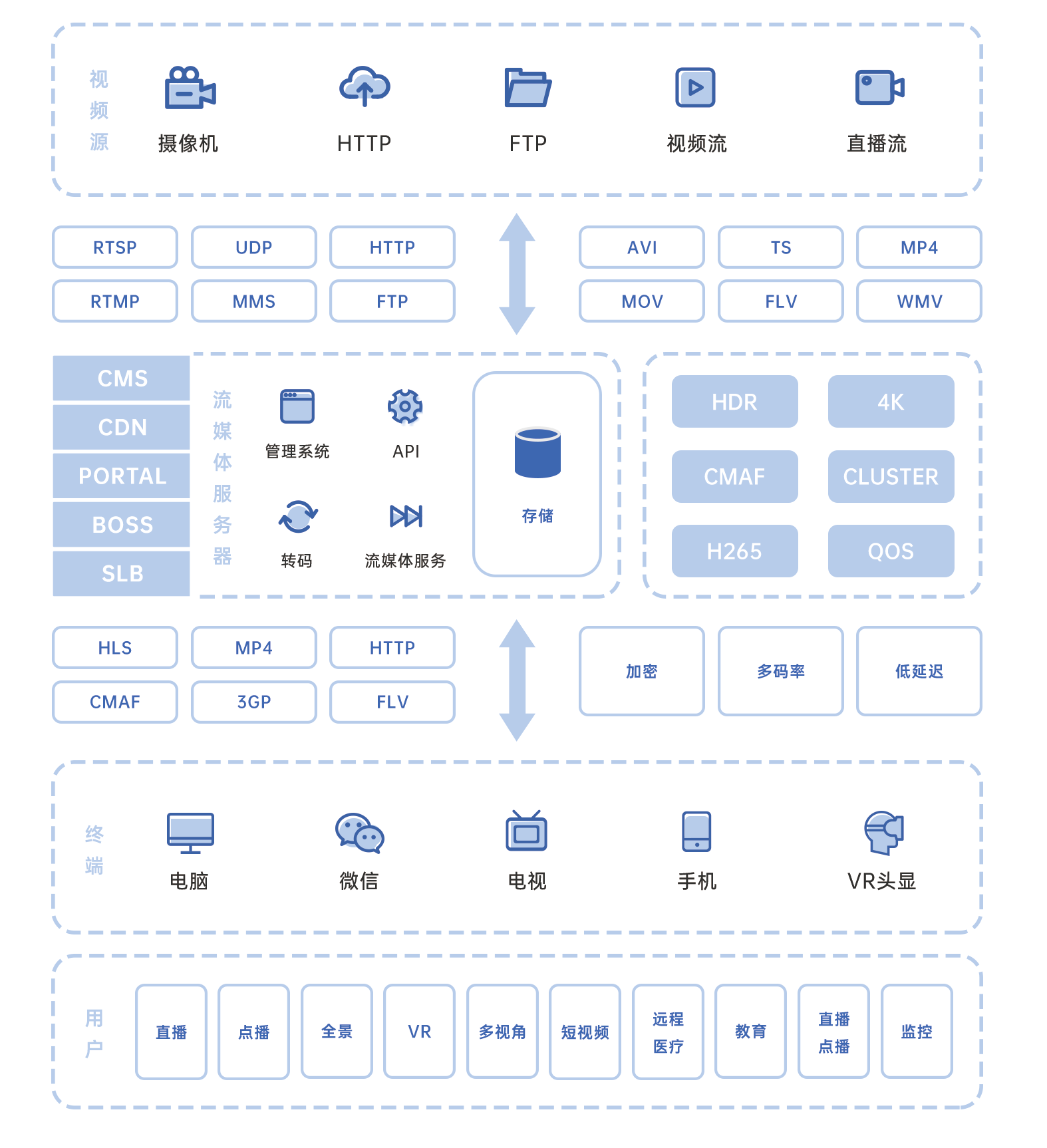 系统支持音视频转码、切片、流媒体服务、文件服务、DRM数字版权管理、加密传输等多种功能。能够支持图片、音频、视频、直播、时移、VR、全景等多种多媒体内容的转码、管理和传输。