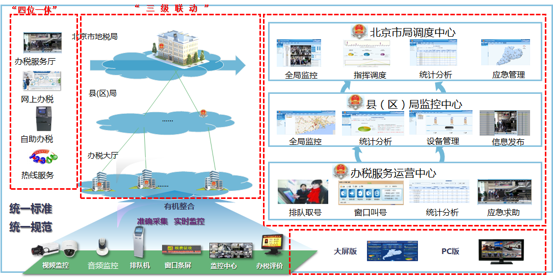广东省办税服务厅实现了全省150个标准化办税服务厅所需音视频监控、排队叫号系统、评价系统设备等的建设和网上预约等多渠道预约业务办理。办税服务厅量化指标采用了现代化手段,科学规划遗留设备兼容方案,智能展现,实时刷新,通过智能显示大屏动态展现四个办税服务渠道运行情况。全省统一的LED公告大屏信息发布,实现集中和分散管理相结合。