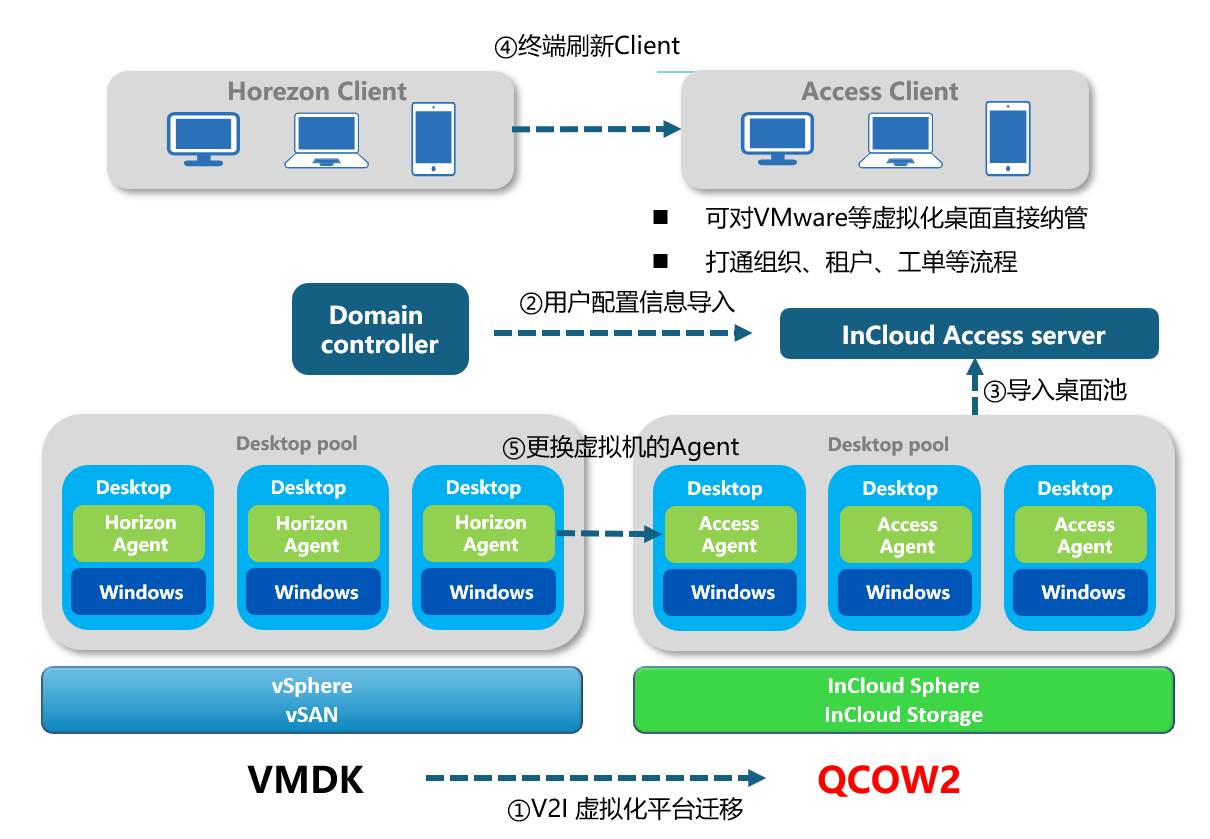 浪潮云海桌面云提供标准化、工具化的迁移流程,旨在实现从VMware Horizon到InCloud Access的平滑过渡。通过 “虚拟机格式转换-用户数据与身份迁移-桌面池配置与发布-终端适配与升级-Agent替换”五步,实现 “业务不中断、数据不丢失、安全不降级”,每一步均配备专属工具与验证机制,降低迁移门槛。