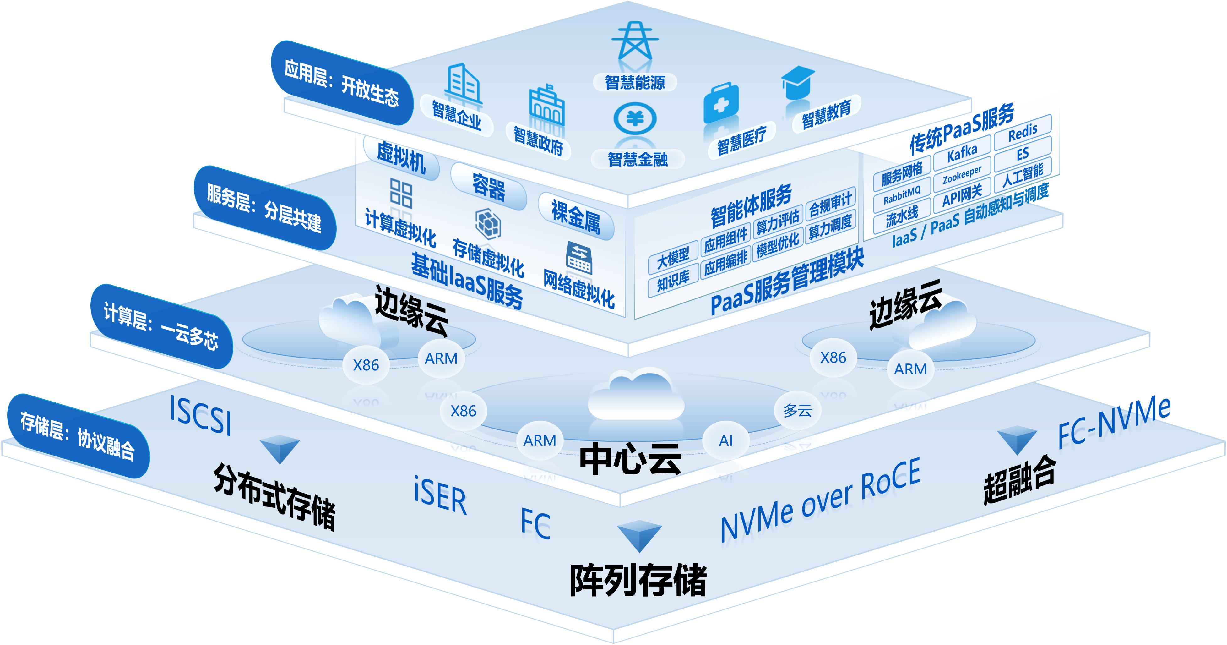 新一代私有云建设框架,可为用户提供自助式一体化的极简运维体验,提供丰富的PaaS云服务能力,统一管理视图监控一云多芯、软硬融合、云数智融合的私有云环境,缓解运维压力,提高管理效率。